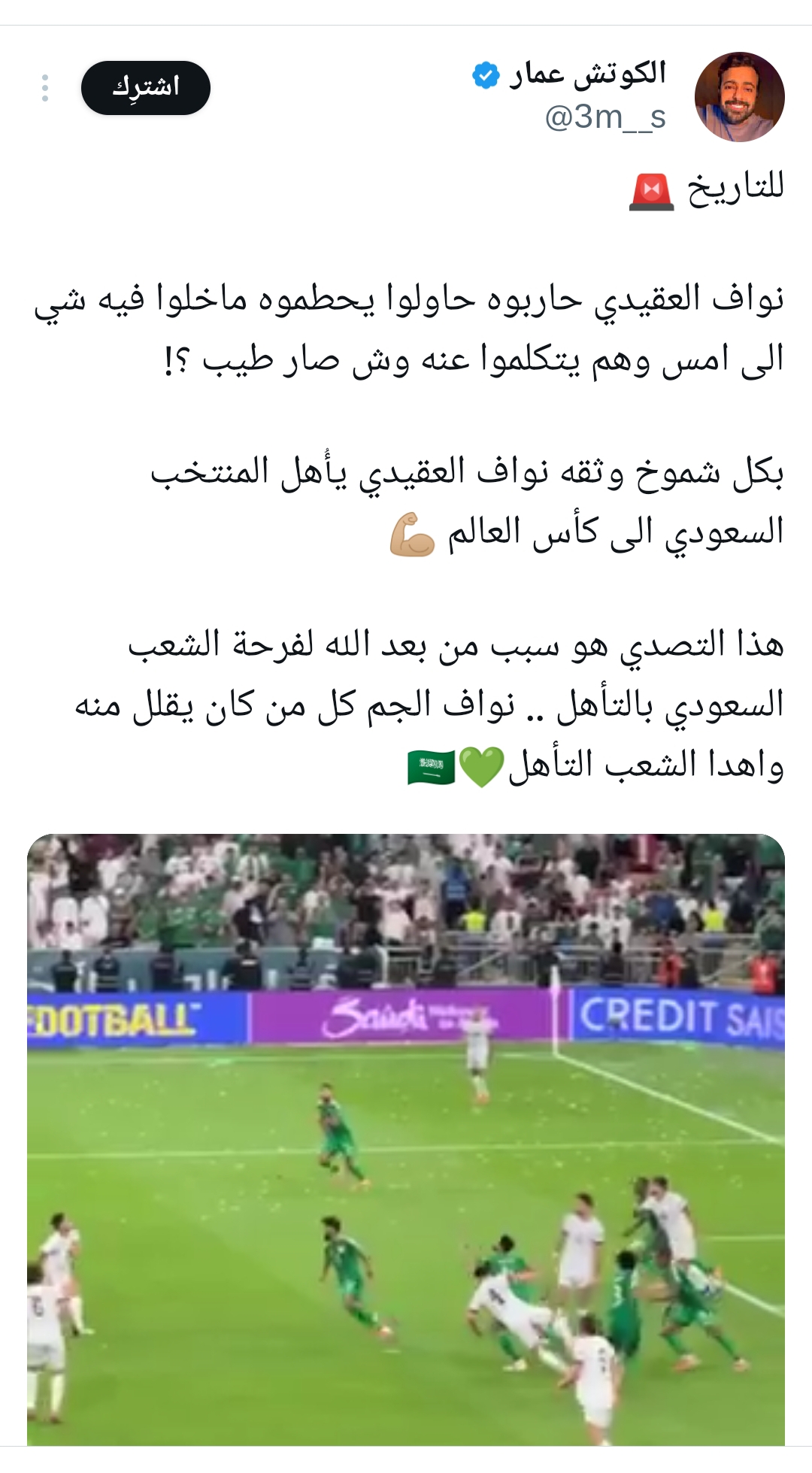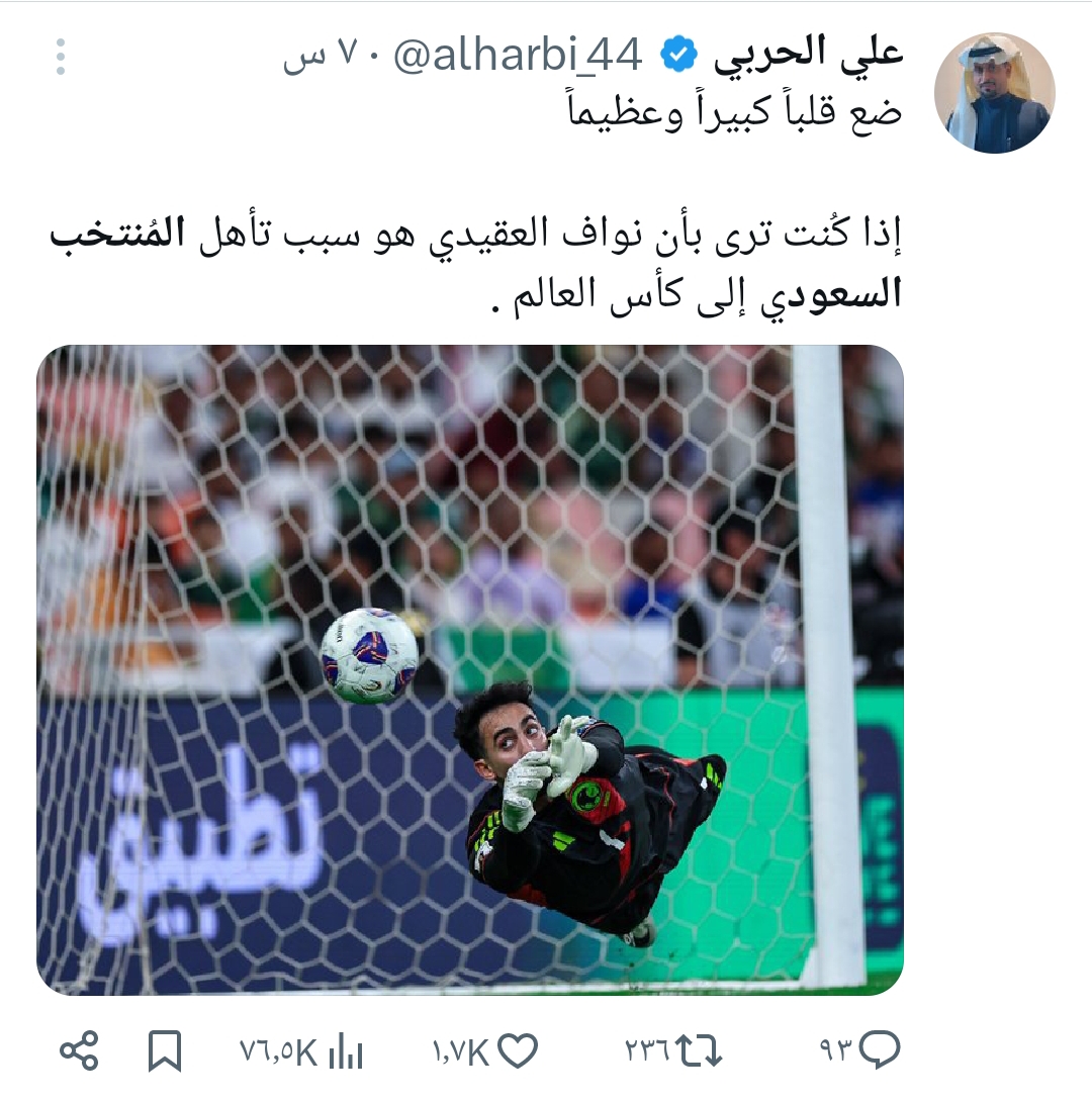 Fan Ali Al-Harbi schrieb: „Legen Sie ein großes, großes Herz an, wenn Sie glauben, dass Nawaf Al-Aqidi der Grund dafür ist, dass sich die saudische Nationalmannschaft für die Weltmeisterschaft qualifiziert hat.“