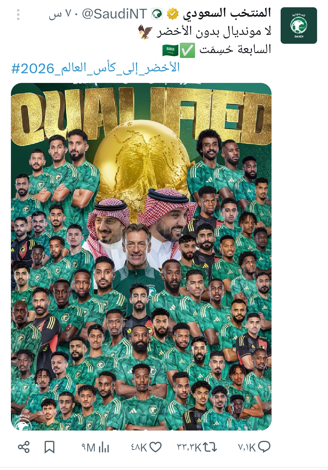 Mit diesem Erfolg stärkt die saudische Nationalmannschaft ihre globale Präsenz weiter, nachdem sie sich bereits 1994, 1998, 2002, 2006, 2018, 2022 und 2026 für die Endrunde der Weltmeisterschaft qualifiziert hatte.