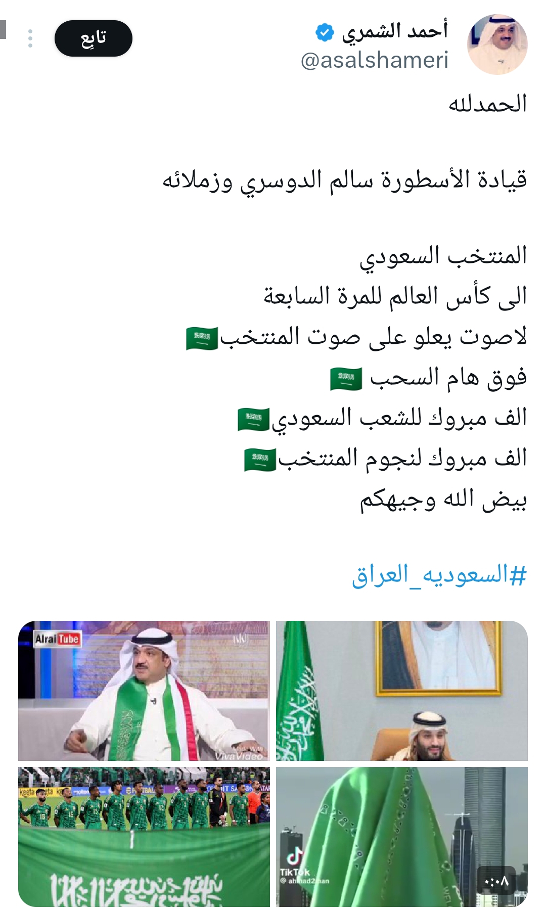 Der Journalist Ahmed Al-Shammari drückte seinen Stolz aus und sagte: „Die Legende Salem Al-Dawsari und seine Teamkollegen … die saudische Nationalmannschaft zum siebten Mal zur Weltmeisterschaft zu führen. Keine Stimme ist lauter als die der Nationalmannschaft 🇸🇦.“