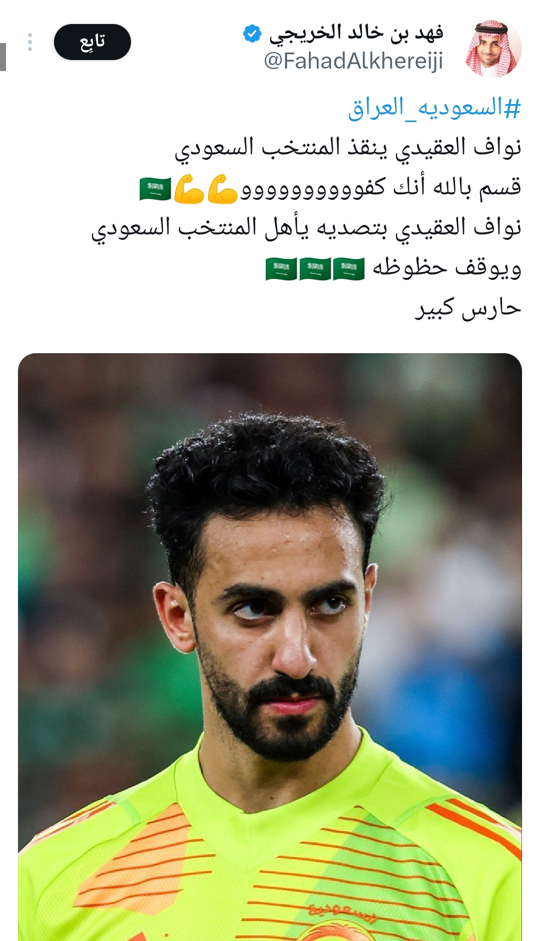 Fahd bin Khalid Al-Khuraiji schrieb und bestätigte: „Nawaf Al-Aqidi rettet die saudische Nationalmannschaft ... Sie sind wirklich fähig! Ein großartiger Torwart.“