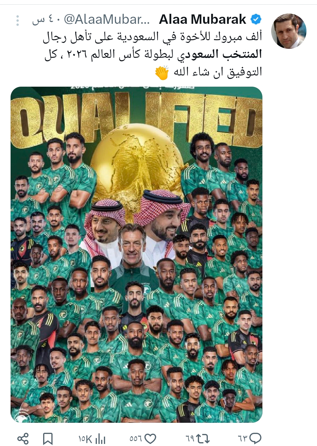 Alaa Mubarak, Sohn des ehemaligen ägyptischen Präsidenten, lobte die Leistung und sagte: „Herzlichen Glückwunsch an unsere Brüder in Saudi-Arabien zur Qualifikation der saudischen Herren-Nationalmannschaft für die Weltmeisterschaft 2026. Wir wünschen ihnen alles Gute, so Gott will.“